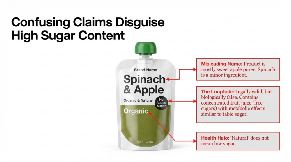 The claim "no added sugar" is one of the most common marketing tactics used to reassure parents, yet it is often functionally misleading. Manufacturers frequently use concentrated fruit juices and purees as hidden sweetening agents. While these ingredients are technically derived from fruit, the industrial manufacturing process involves intense maceration and heat treatment. This mechanical breakdown results in intrinsic sugars liberated from cell walls, transforming them into "free sugars" that behave more like syrup than whole fruit within the body.