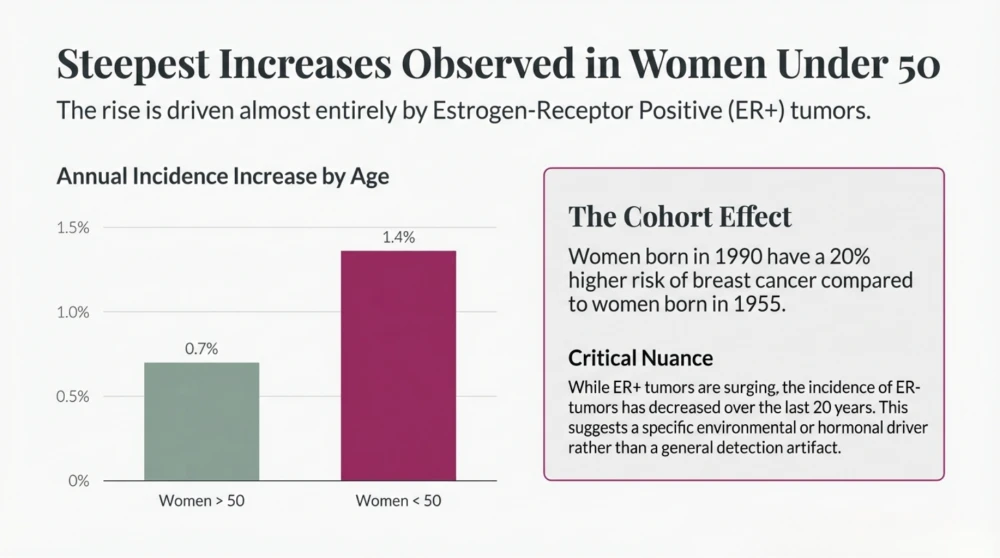 Another point to understand is subtype behavior. A large share of the recent rise appears in hormone receptor related patterns, especially estrogen receptor positive disease in many datasets. This matters because hormones, metabolism, and long-term lifestyle exposures may influence risk more than we previously appreciated.