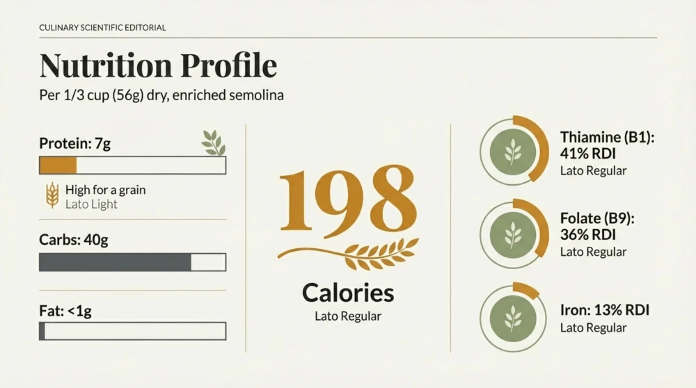 A 1/3 cup serving of uncooked, enriched sooji provides approximately 198 calories and 7 grams of protein. It is a nutritional powerhouse when it comes to B-vitamins, offering 41 percent of the RDI for thiamine and 36 percent of the RDI for folate. These vitamins are essential for converting your daily meals into usable energy and supporting cellular function.