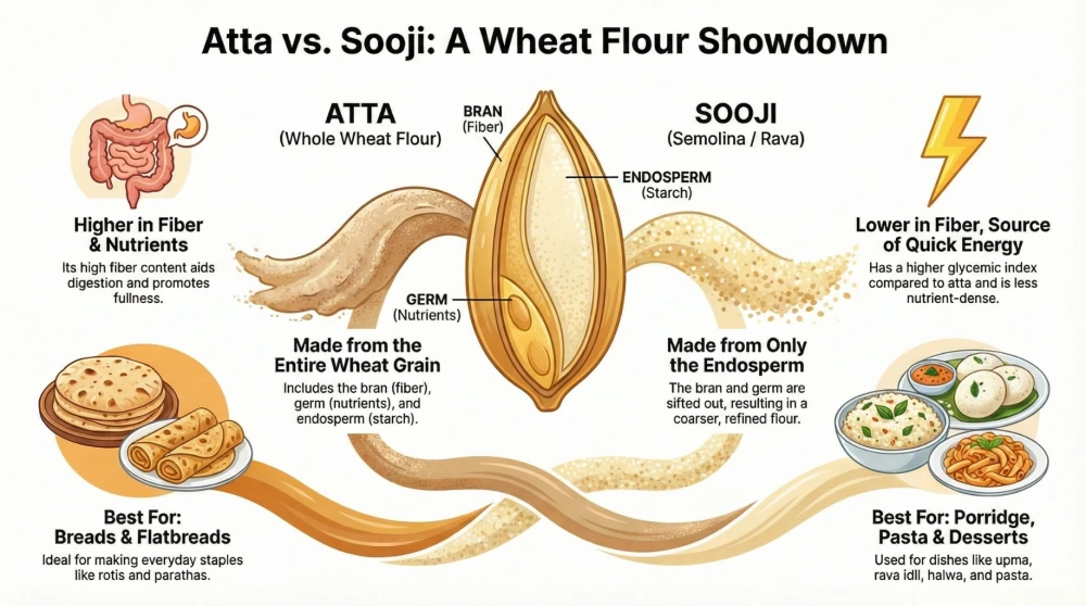 There is a viral debate suggesting sooji is simply maida in a different texture. This is an oversimplification that misses key clinical distinctions. In the milling world, Bombay rava is often a byproduct of maida processing, whereas Chamba rava is obtained from whole wheat. However, even the standard sooji sits somewhere in between maida and whole wheat (atta) in terms of refinement and impact on the body.