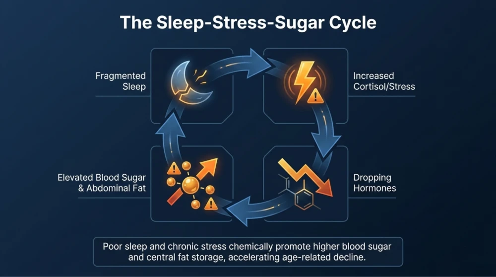 Sleep patterns often change with age, and many individuals experience lighter or fragmented sleep. Poor sleep directly affects insulin sensitivity and increases stress hormone levels.