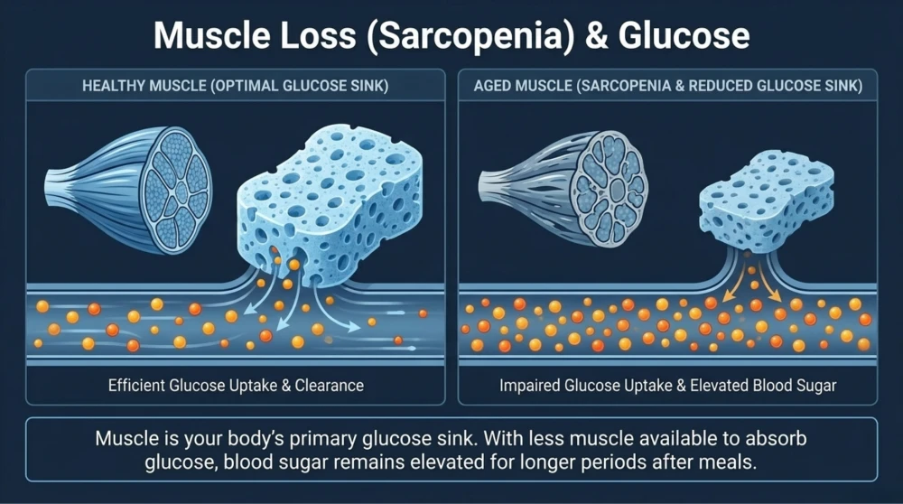 With less muscle available to absorb glucose, blood sugar remains elevated for longer periods after meals.