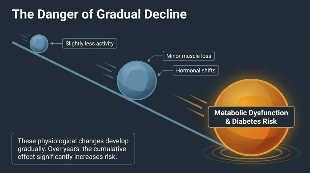 The challenge with age-related metabolic changes is that they develop gradually. Each factor, whether reduced activity, hormonal changes, or increased fat mass, contributes incrementally.