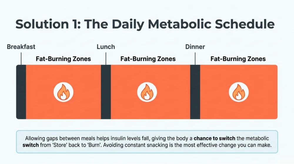Allowing gaps between meals helps insulin levels fall, giving the body a chance to switch from storage mode to fat-burning mode. Avoiding constant snacking is one of the simplest yet most effective changes.