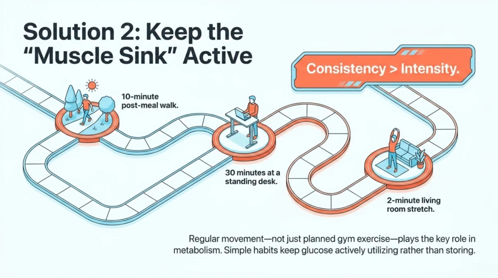 Regular movement, not just planned exercise, plays a key role in metabolism. Simple habits like walking after meals or reducing sitting time can significantly improve glucose utilization.