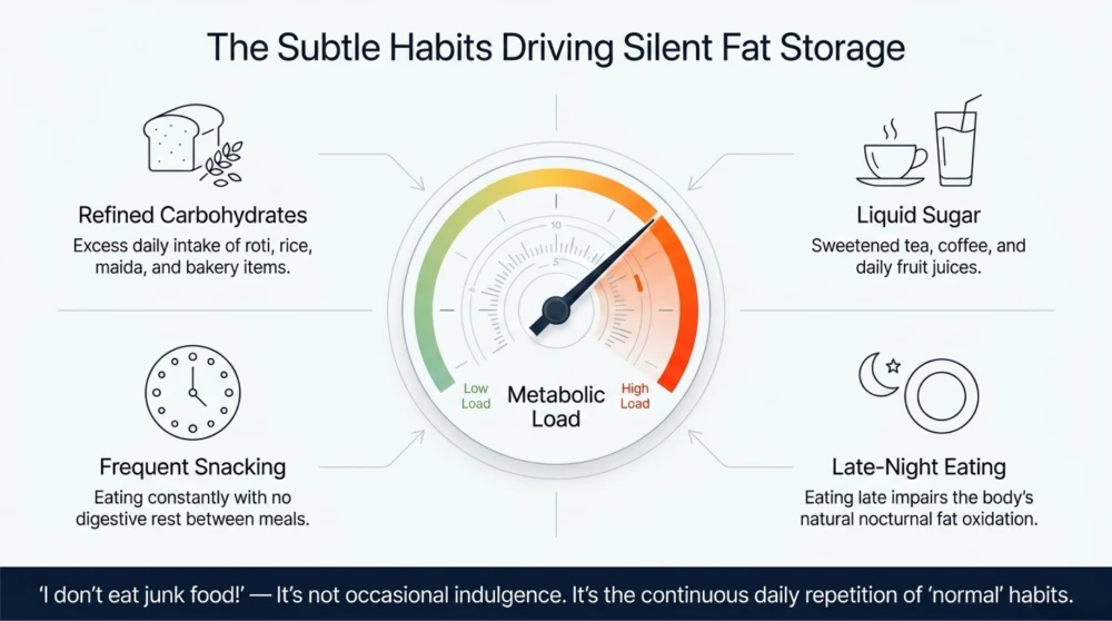 - Regular intake of refined carbohydrates (roti, rice, bakery items in excess)
