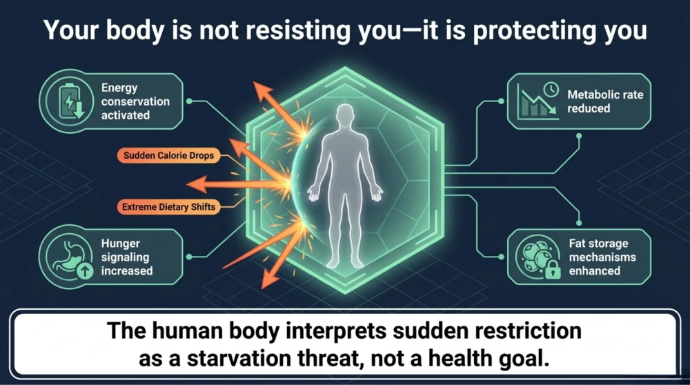 Understanding why your body resists sudden diet changes is critical if you want sustainable fat loss, better metabolic health, and long-term results. The human body is designed to maintain internal balance. Any sudden or extreme shift—especially related to food intake—is perceived as a stress signal.